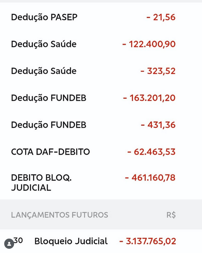 O bloqueio foi executado por meio do sistema eletrônico SISBAJUD, que também determinou a retenção automática das próximas parcelas de transferências federais — entre elas, a cota-parte do FPM — até a quitação integral da dívida.