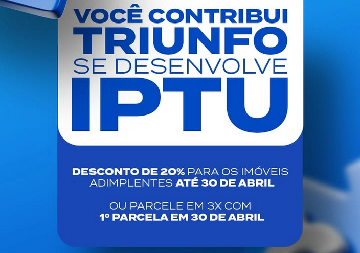 Prefeitura de Triunfo orienta contribuintes sobre condições para pagamento do IPTU 2026 A Prefeitura de Triunfo, por meio da Secretaria Municipal de Finanças, informa aos contribuintes as condições especiais disponíveis para o pagamento do IPTU 2026. Os imóveis adimplentes...
