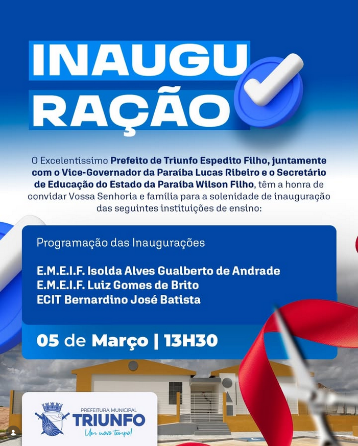 4 mar 2026 - NotíciasA Prefeitura Municipal de Triunfo realizará, no próximo dia 5 de março, às 13h30, a solenidade de inauguração de importantes instituições de ensino no município. O evento contará com a presença do prefeito Espedito Filho, do vice-governador da Paraíba, Lucas Ribeiro, e do secretário de Educação do Estado, Wilson Filho, reunindo autoridades, educadores e a população.