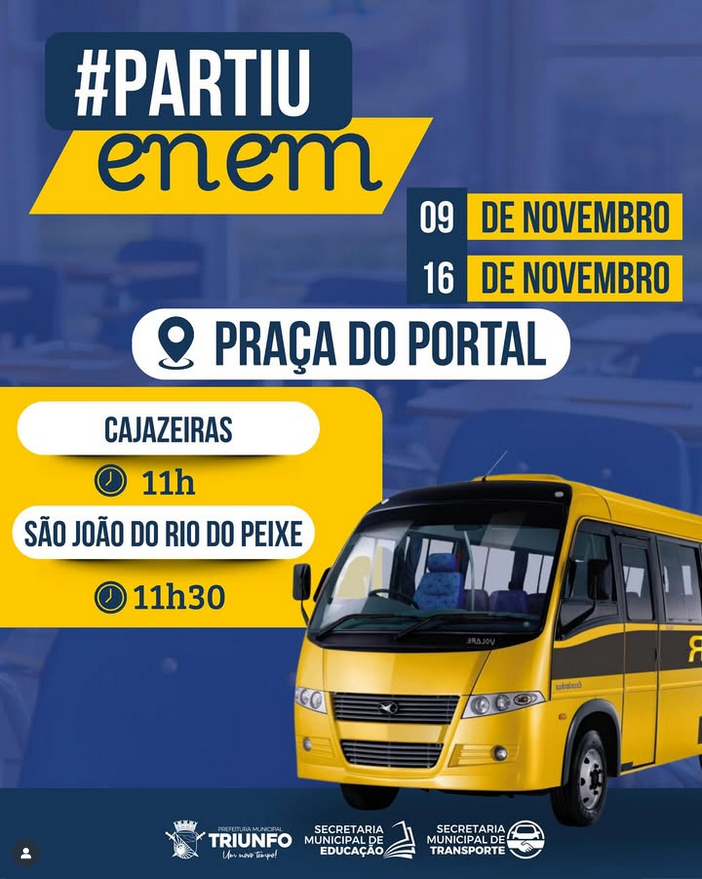 7 nov 2025 - NotíciasA Prefeitura de Triunfo, por meio das Secretarias de Educação e de Transporte, está disponibilizando ônibus gratuito para os alunos do município que farão o Exame Nacional do Ensino Médio (ENEM) 2025.