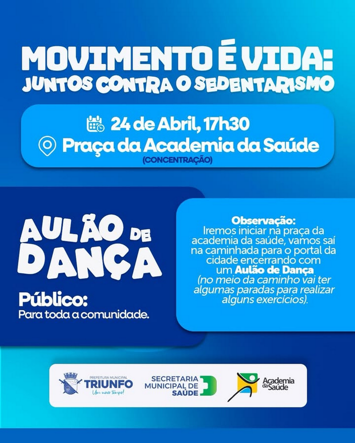 15 abr 2026 - NotíciasA Prefeitura de Triunfo, por meio da Secretaria Municipal de Saúde, promove no próximo dia 24 de abril, a partir das 17h30, a ação “Movimento é Vida: juntos contra o sedentarismo”, com concentração na Praça da Academia da Saúde.
