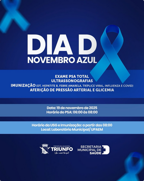 A Secretaria Municipal de Saúde realizará, no dia 19 de novembro de 2025, o Dia D do Novembro Azul, com oferta de serviços de prevenção e cuidado voltados ao público masculino. As ações acontecerão no Laboratório Municipal/UPAEM.