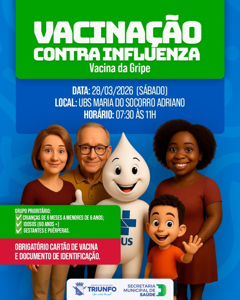 27 mar 2026 - NotíciasA Prefeitura de Triunfo realiza, neste sábado, 28 de março, a vacinação contra a influenza na UBS Maria do Socorro Adriano, das 7h30 às 11h.